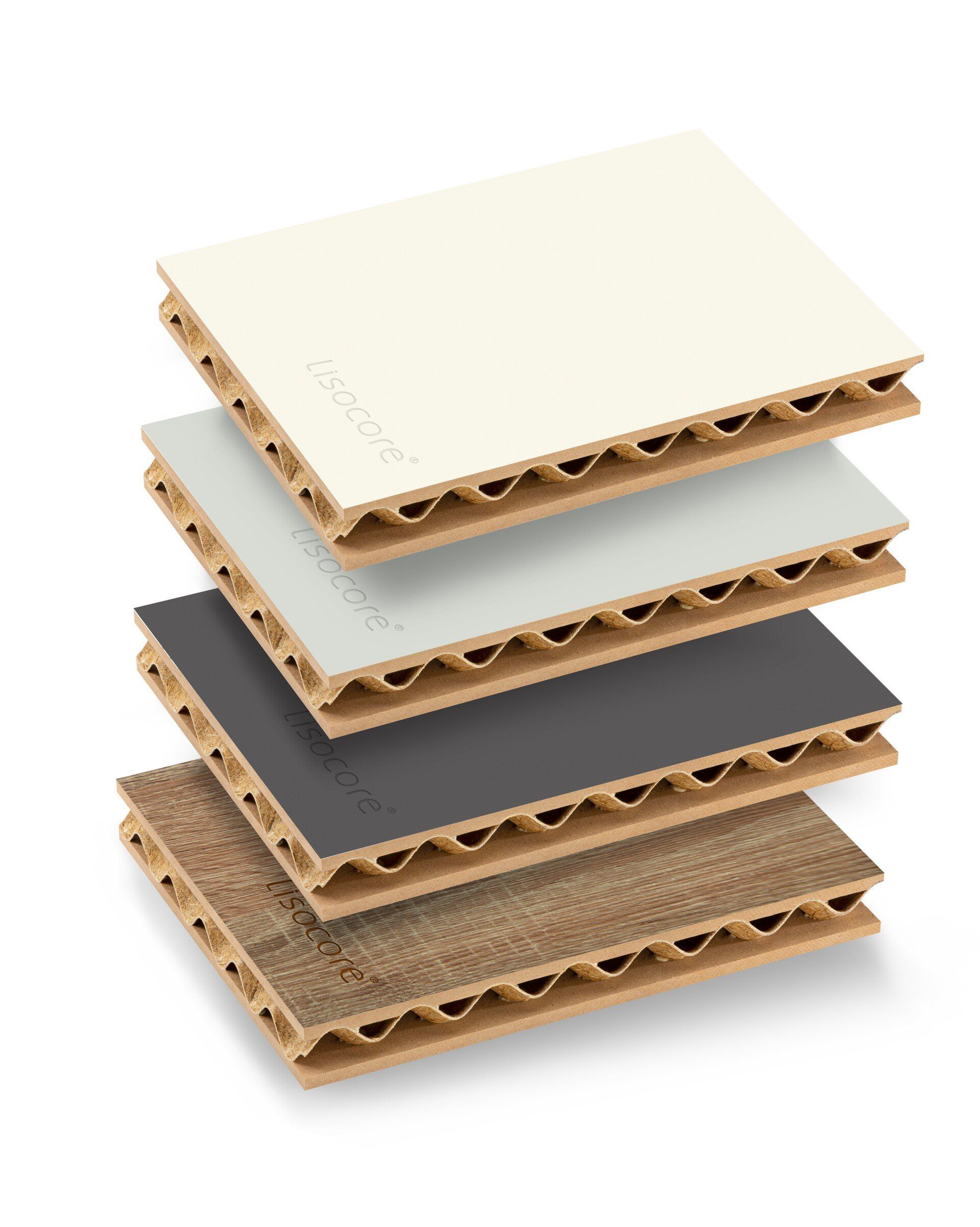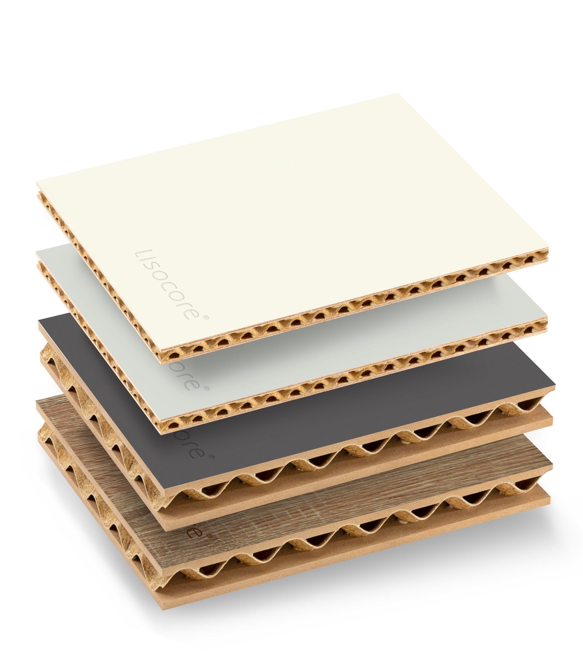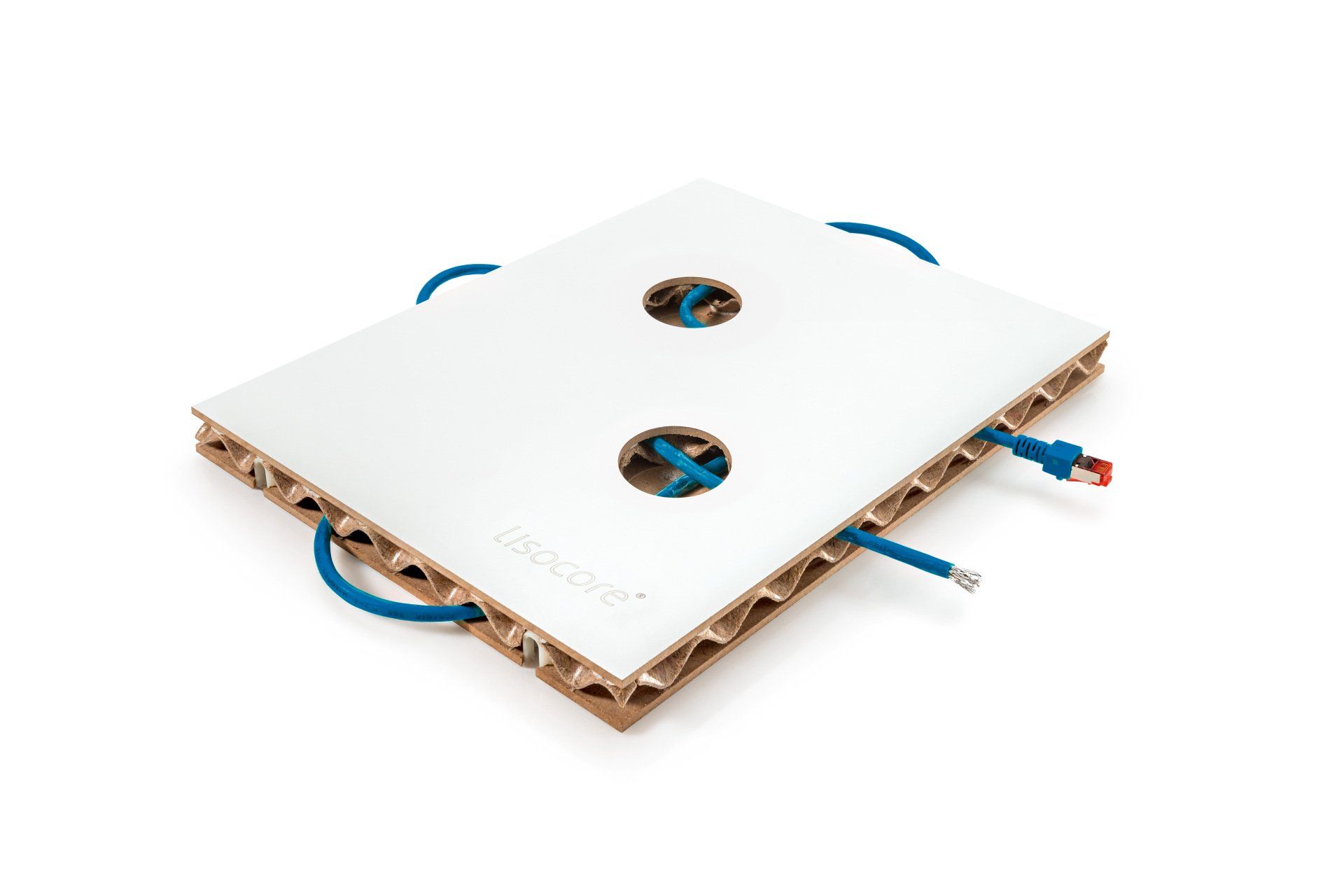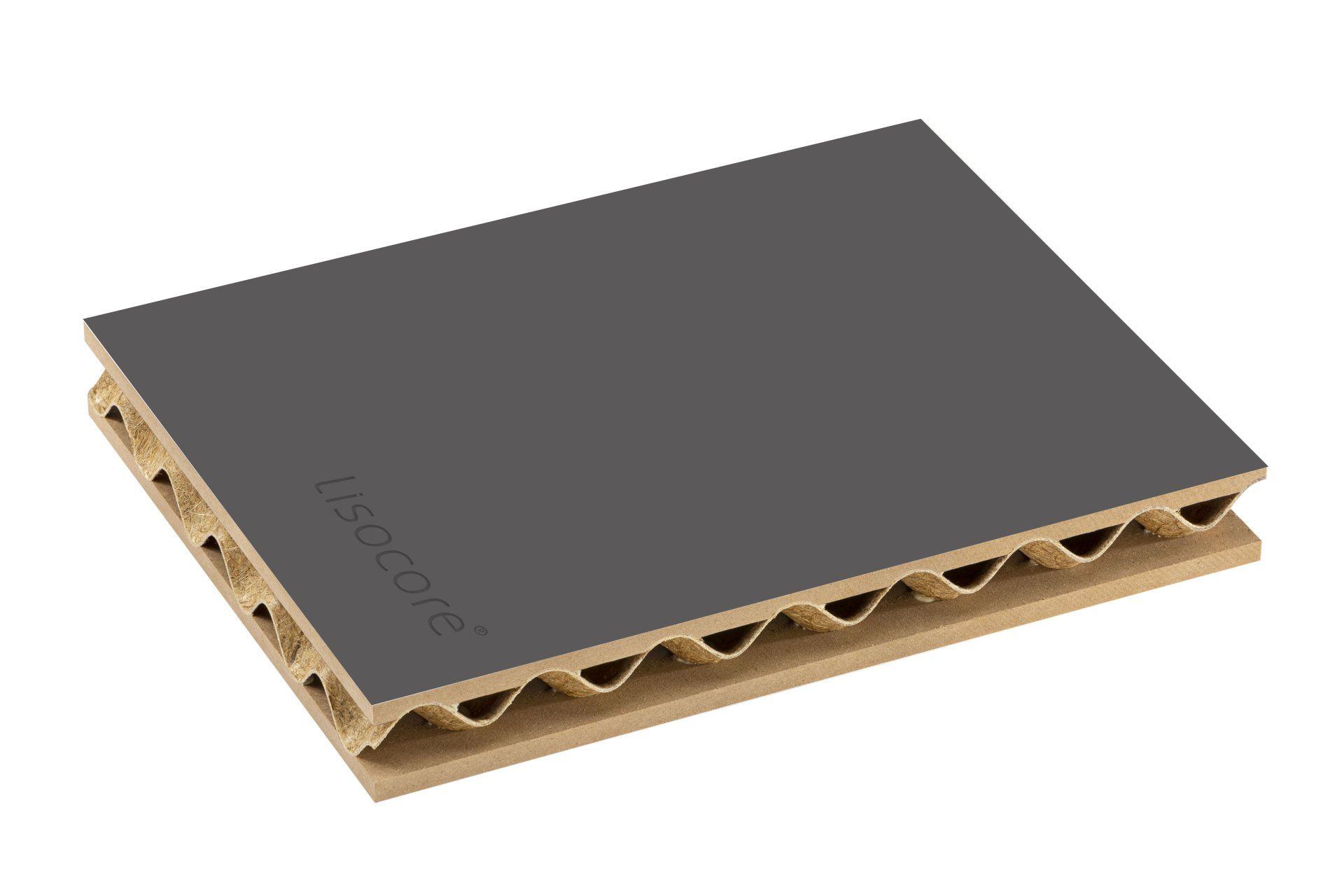 Il pannello LISOCORE® è composto da una struttura tridimensionale incollata tra due copertine. Le forature sono studiate appositamente per un perfetto adattamento della struttura interna tridimensionale che viene incollata in prossimità dei fori così da ottenere un prodotto altamente solido e più resistente rispetto ad altri materiali leggeri. Spazi cavi longitudinali, trasversali e diagonali, utili per eventuali installazioni (come passacavi), struttura multistrato, forma plasmabile in due dimensioni, flessibilità in termini di spessore e una importante leggerezza.