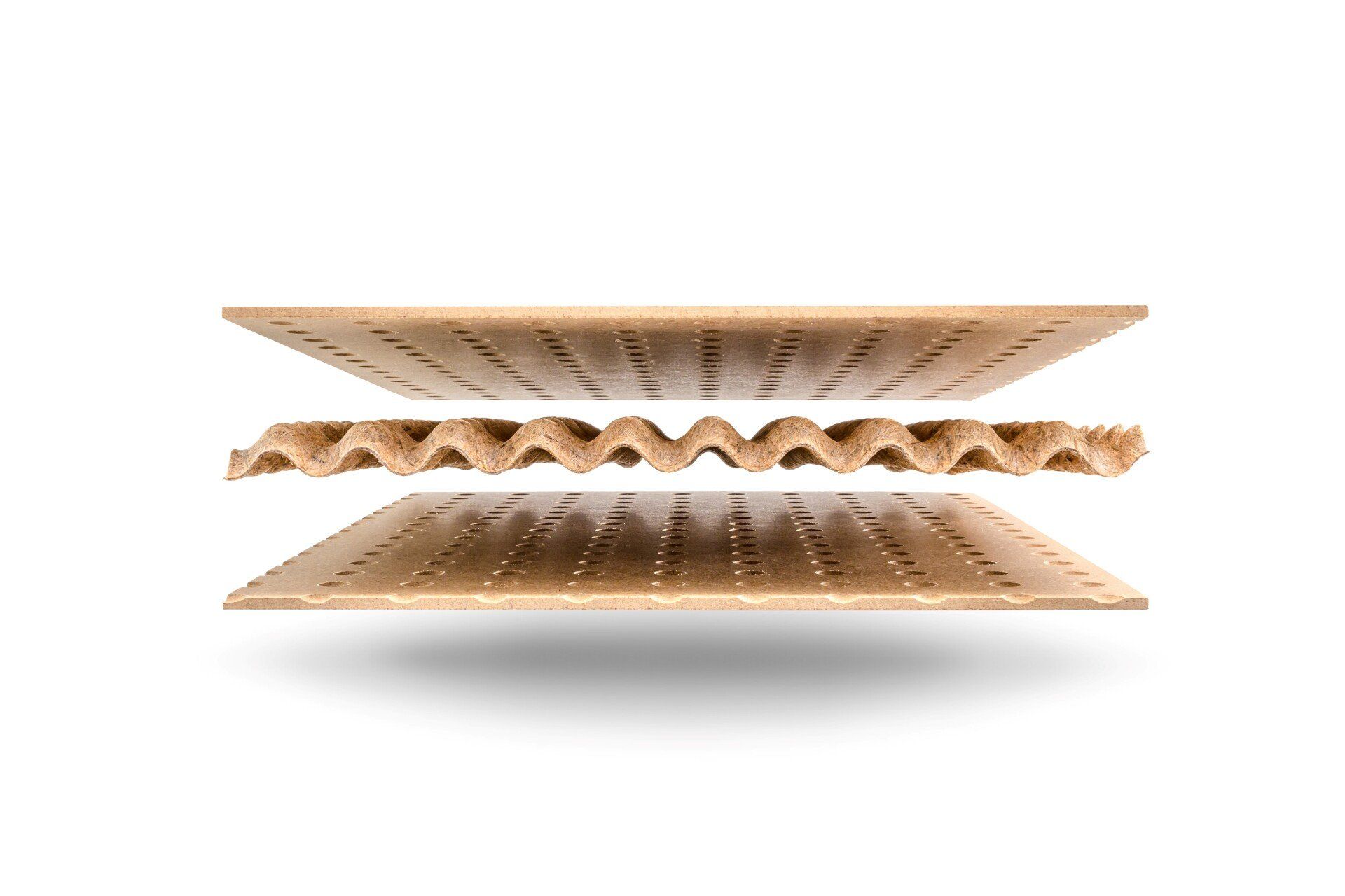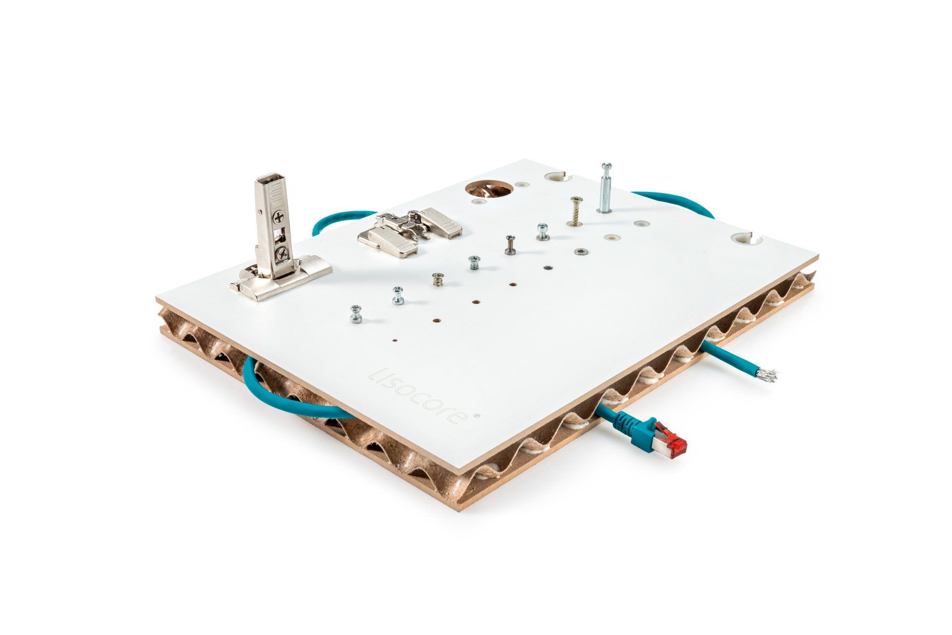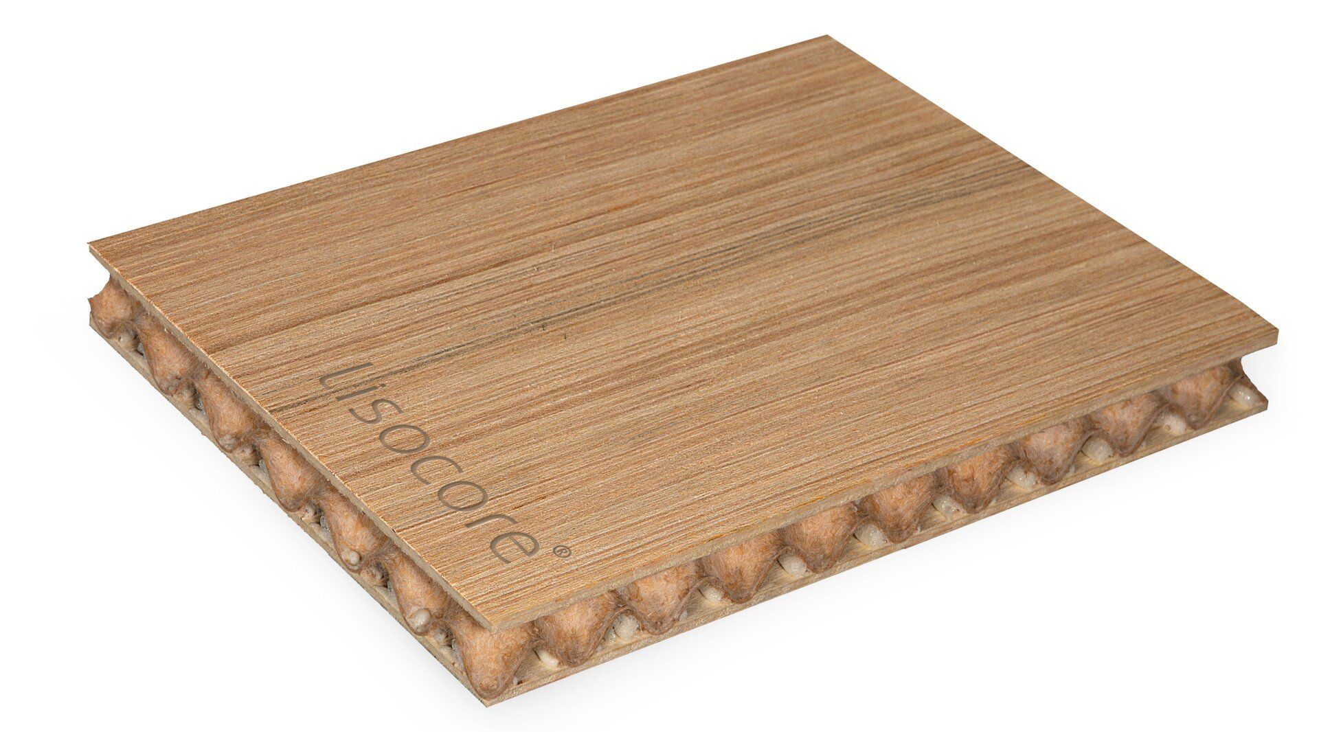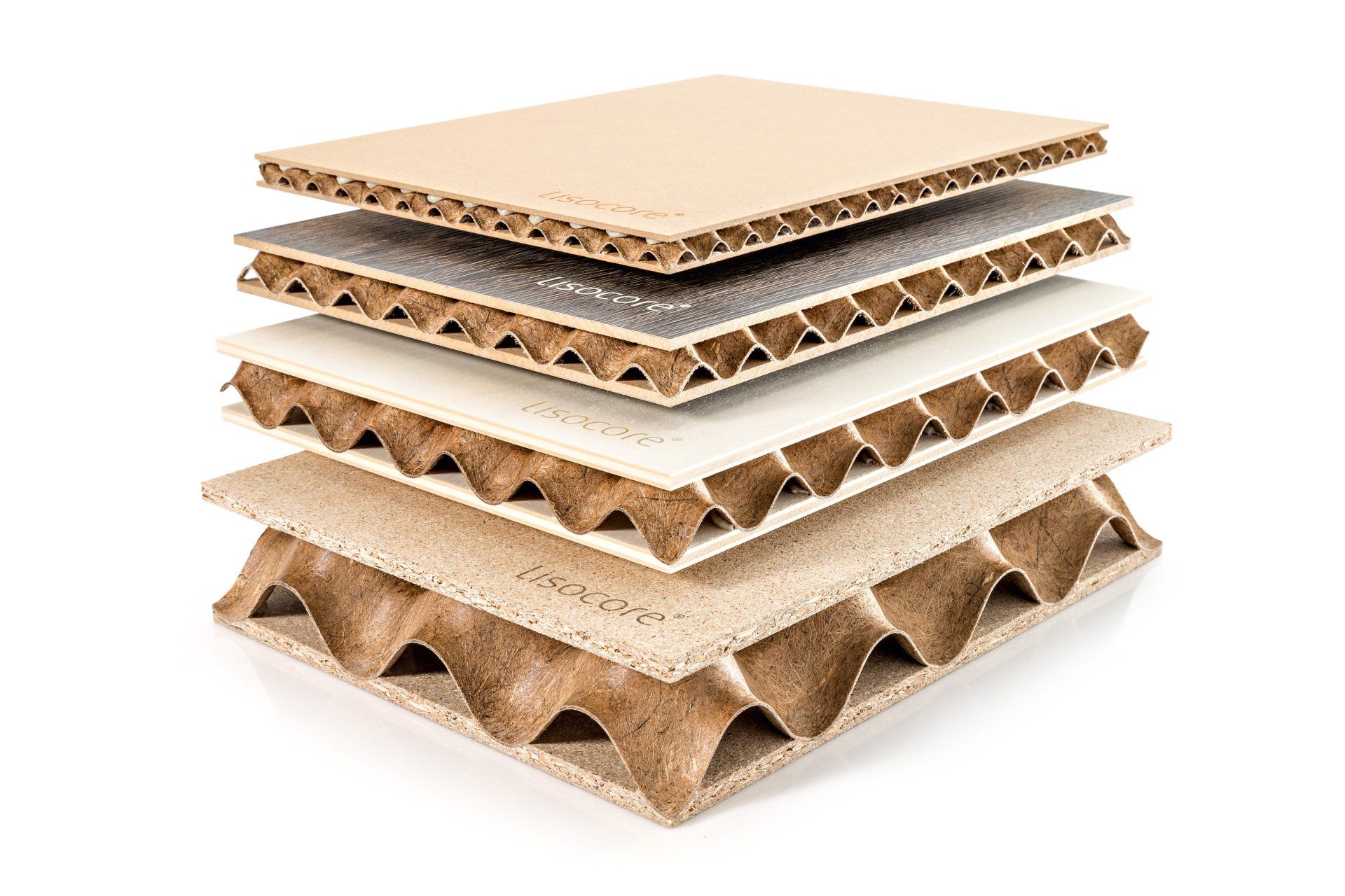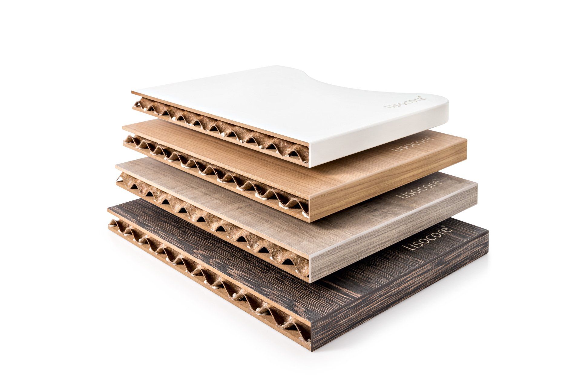 Il pannello LISOCORE® è composto da una struttura tridimensionale incollata tra due copertine. Le forature sono studiate appositamente per un perfetto adattamento della struttura interna tridimensionale che viene incollata in prossimità dei fori così da ottenere un prodotto altamente solido e più resistente rispetto ad altri materiali leggeri. Spazi cavi longitudinali, trasversali e diagonali, utili per eventuali installazioni (come passacavi), struttura multistrato, forma plasmabile in due dimensioni, flessibilità in termini di spessore e una importante leggerezza.